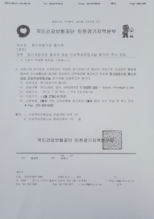 장기요양기관 종사자 대상 건강백세운동교실 참가자 추가 모집 페이지 정보 작성자 어른이 도움센터 작성일22-04-25 14:48 조회6,125회 댓글0건 관련링크 목록 본문 코로나 19 장기화로 근로여건이 악화된 장기요양기관 종사자 대상으로 건강증진 활동을 통하여 건강생활실천 환경을 조성하고 근무여건을 제고하기 위하여 장기요양기관 종사자대상 건강백세운동교실 참가자를 모집하고자 합니다.이하 첨부파일 참고하시기 바랍니다. 어른이도움센터장 목록