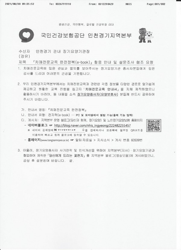 치매전문교육 완전정복 e-book 활용 안내 협조문 페이지 정보 작성자 어른이 도움센터 작성일21-08-30 13:04 조회5,293회 댓글0건 관련링크 목록 본문 국민건강보험공단 인천경기지역본부에서 치매관련 안내서를 만들었습니다. 첨부파일 확인하시고 활용하시기 바랍니다.어른이도움센터 목록